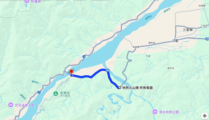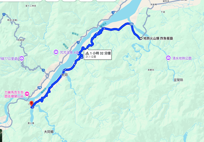 地熱火山爆炸魚餐廳(起點) → 延泰雅一路(台7丙) →左轉接泰雅一路牛鬥巷(宜51) → 經大同產業道路(宜51)→ 經天狗溪(田古爾橋) →右轉多望大橋折返→地熱火山爆炸魚餐廳(終點)