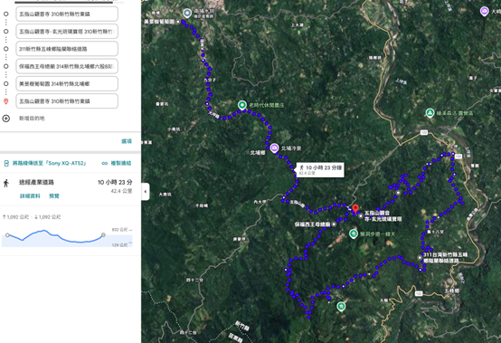 ■42K全馬組 點觀音寺->右轉->上坪-大窩木藝蘭園 -上坡-綠舟共生小棧->隘蘭聯絡道à櫻之林露營區à風雅月築à下坡-山秀休閒農場-->觀音寺-->北埔冷泉-->南埔折返--> 北埔冷泉-->觀音寺